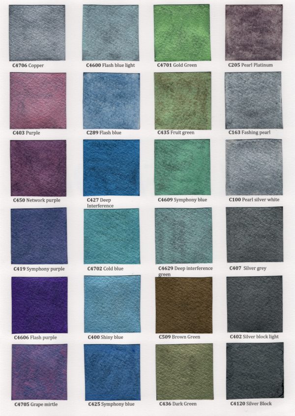 | Farbe | C303 Royal gold, (28)C300 Pearl golden, C4707 Golden marnoon, (34)C307 Green gold, C4602 Flash yellow, (33)C4703 Apricot, C630 Deep interference, C421 Symphony yellow, (7)C4628 Deep interference yellow, (19)C500 Bronze, (20)C520 Bronze satin, (24)C430 Flashing copper brown, (10) C503 Red brown, C510 Brown, (15)C411 Dark brown, (38) C508 Gem red, (21)C415 Color red, (30)C4605 Flash red, (22)C504 Wine red, (16)C525 Purple satin, (18)C418 Rose red, (29) C4625 Deep interference red, (35)C524 Wine red satin, (12) C422 Pink, (1)C4705 Grape mirtle, (17)C4606 Flash purple, (5)C419 Symphony purple, (4)C450 Network, (27) C403 Purple, (13)C4706 Copper, (8)C425 Symphony blue, (11)C400 Shiny blue, (31)C4702 Cold blue, (25)C427 Deep Interference, C289 Flash blue, C4600 Flash blue light, (3)C436 Dark green, (2)C509 Brown green, C4629 Deep interference green, (23)C4609 Symphony blue_2, (6)C435 Fruit green, (14)C4701 Gold green, (32)C4120 Silver block, (9)C402 Silver block light, (36)C407 Silver gray, (26)C100 Pearl silver white, C163 Fashing pearl, C205 Pearl platinum |